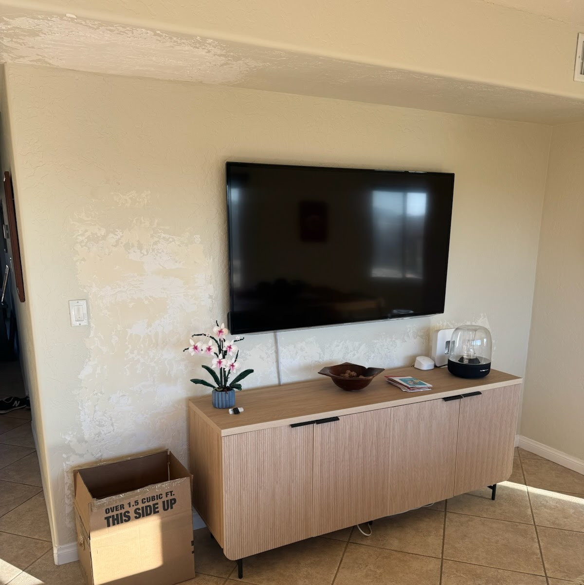The "before" shot captures the raw, porous drywall compound and textured patches that look like unfinished puzzles across the wall.